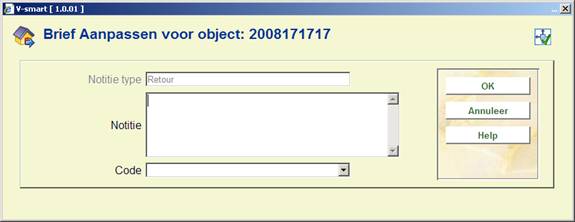 : U kunt deze optie gebruiken om een boodschap te definiëren / updaten die wordt getoond op het moment dat het exemplaar wordt teruggebracht. Er is slechts één “notitie bij innemen” per exemplaar (uitlening). Het systeem toont u automatisch de inhoud van de notitie. U kunt de tekst eventueel aanpassen.