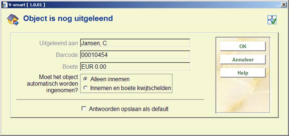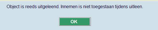 Als aan het object een noot is gekoppeld, verschijnt een informatiescherm met de noot. Deze noot op objectniveau wordt ingevoerd in AFO 423 (‘Beheer objecten'). Deze noot wordt bij het uitlenen en het innemen getoond. Vervolgens wordt het object uitgeleend en zal het systeem naar een volgend object vragen.