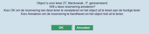 Wanneer een andere lener dan degene voor wie de reservering klaarstaat het exemplaar wil lenen, verschijnt deze melding:
