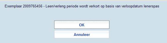 Wanneer ook de parameter Toon waarschuwing wanneer leenperiode verkort wordt als gevolg van vervaldatum lenerspas in AFO 481 – Diversen – Uitleenprocedure – Uitleen is aangevinkt, verschijnt onderstaande melding: