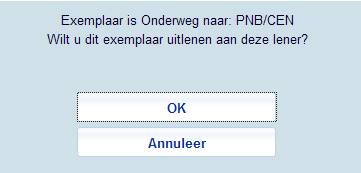 Wanneer de parameter “Toestaan uitlening van exemplaar dat In Transit is? in AFO 481 – – Diversen – Uitleenprocedure – Uitleen is aangevinkt, dan is het mogelijk de transit status te negeren en het exemplaar uit te lenen. Wanneer de parameter "Toon waarschuwing bij toestaan uitlening van exemplaar dat In Transit is" ook is aangevinkt, dan verschijnt de volgende meldingen bij het uitlenen van een exemplaar dat in transit is: