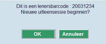 Wanneer u een lenersbarcode scant voordat u de vorige sessie beëindigd heeft zijn er twee mogelijkheden, afhankelijk van een parameter in AFO 481 – Diversen – Uitleenprocedure – Uitleen.