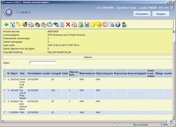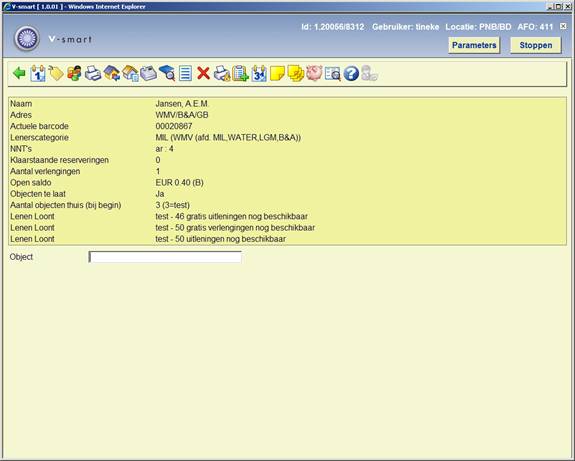 Nadat de lener geïdentificeerd is, toont het systeem ofwel een foutmelding, ofwel een informatiescherm (dat gegevens bevat m.b.t. de geïdentificeerde lener), ofwel schakelt het door naar het eigenlijke uitleenscherm.